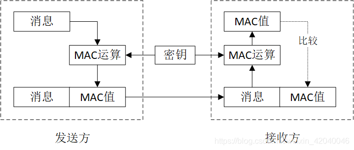 MAC值一般和原始消息一起传输,原始消息可以选择加密,也可以选择不加密,通信双方会以相同的方式生成MAC值,然后进行比较,一旦两个MAC相同表示验证正确,否则验证失败。