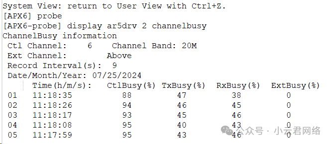 吐槽一下:某C的AC上不能直接显示各个AP的信道利用率,需要telnet登录该AP才行,相当麻烦。继续吧,telnet到小票机所在AP后,通过下述命令: