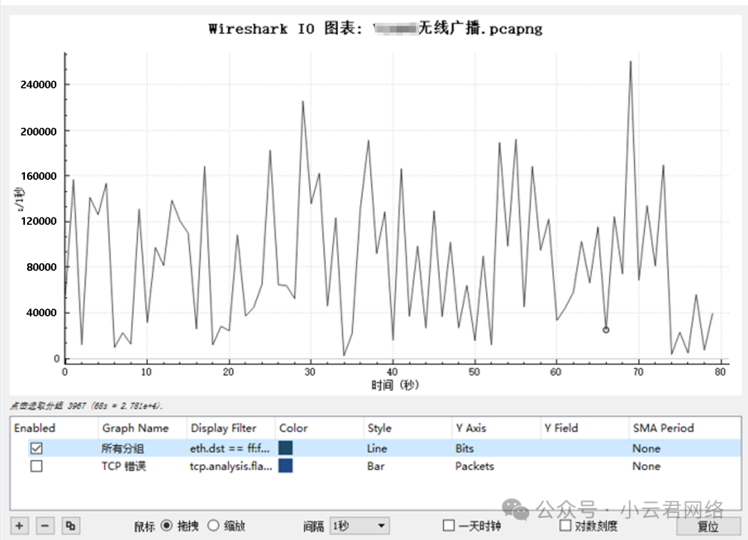 从抓包结果来看,内网广播流量峰值约200Kbps,而AP 2.4G的默认广播发送速率为1Mbps,所以判断内网的广播流量对无线信道的占用约20%。