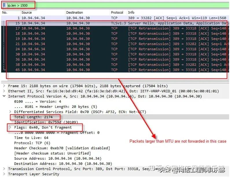 网络 MTU 大小经常是问题的根源。因此,我们可能需要检查是否有大于默认 MTU 大小的数据包。