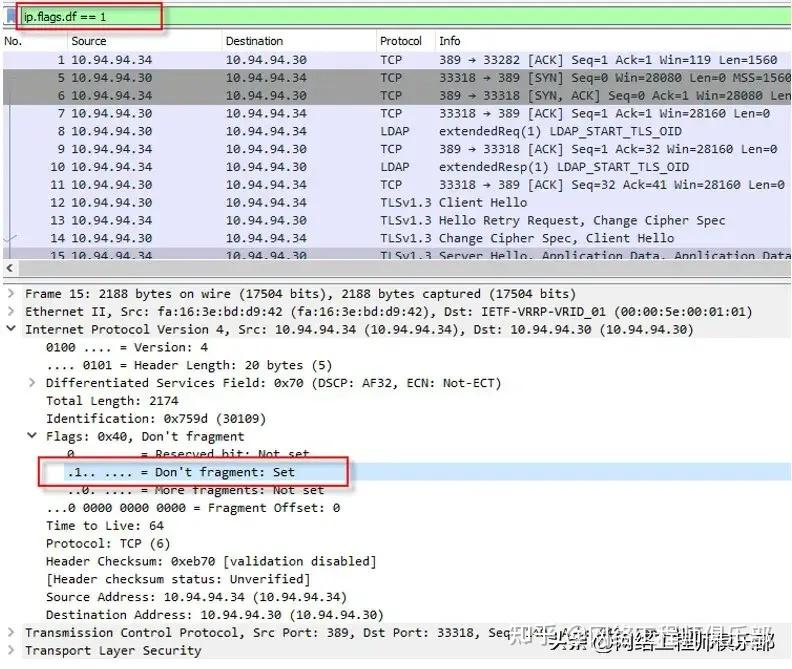 某些应用程序不希望其数据包在网络中被碎片化。当路径上的设备(路由器、防火墙、交换机等)收到这些数据包时,它们会检查这些数据包是否大于 MTU 大小,如果是,设备会丢弃这些数据包,从而导致故障。可以使用以下过滤器。