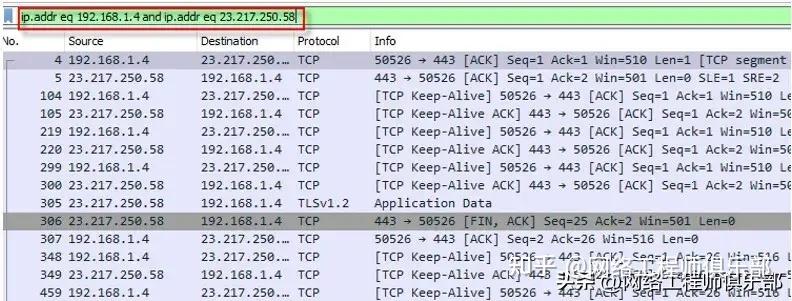 当我们想要查找所有进出某个主机的数据包时,我们会使用下面的过滤器。