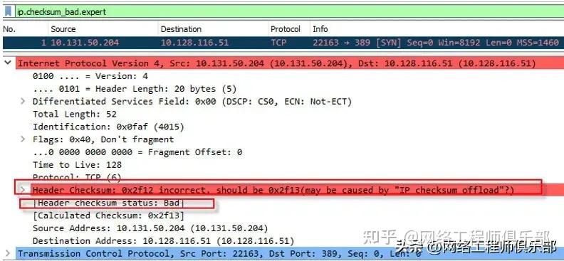 16 位报头校验和字段用于 IPv4 报头的错误检查。在传输过程中,数据包的 IP 报头可能会损坏,从而导致数据包丢失。校验和用于检测损坏的数据包。下面的过滤器可用于查找这些数据包。